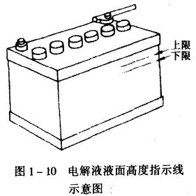 2)液面高度指示線法:通過(guò)觀察液面高度指示線可以檢查電解液的液面高度(圖1-10),對(duì)使用透明工程塑料容器的蓄電池,為檢查液面高度,在容器壁上刻有兩條高度指示線。正常液面高度應(yīng)介于兩線之間,低于下線為液面過(guò)低,應(yīng)加蒸餾水進(jìn)行補(bǔ)充。