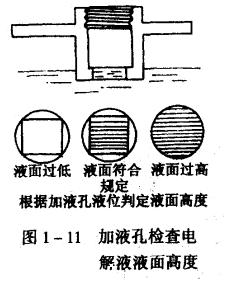 3)加液孔觀察判斷法:部分進(jìn)口小汽車(chē)在電解液加液孔內(nèi)測(cè)的標(biāo)準(zhǔn)液面位置處開(kāi)有方視孔(圖1-11),可觀察液面在方孔的下面時(shí)則液面過(guò)低;若液面正好與方孔平齊時(shí)則液面高度為標(biāo)準(zhǔn)值;當(dāng)液面滿(mǎn)過(guò)方孔而充滿(mǎn)加液口底部以上時(shí)為過(guò)多。