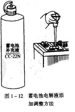 發(fā)現(xiàn)電解液液面高度低于標(biāo)準(zhǔn)值時(shí),應(yīng)及時(shí)補(bǔ)充蒸餾水。除確知液面降低時(shí)由電解液濺出所導(dǎo)致外,不允許補(bǔ)充硫酸溶液。這是因?yàn)殡娊庖阂好嬲=档蜁r(shí)由電解液中的蒸餾水被電解和蒸發(fā)所致。蓄電池電解液添加方法如圖1-12.